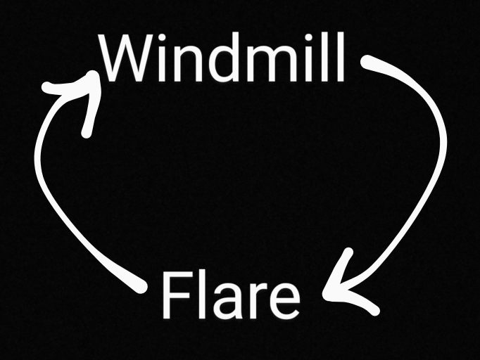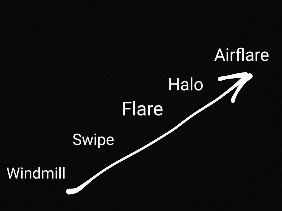 POWERMOVES are movements emphasizing dynamics. When non-dancers think of breakin they probably think of one of these moves. FLIPS and TRICKS are related to powermoves.Some POWERMOVES: