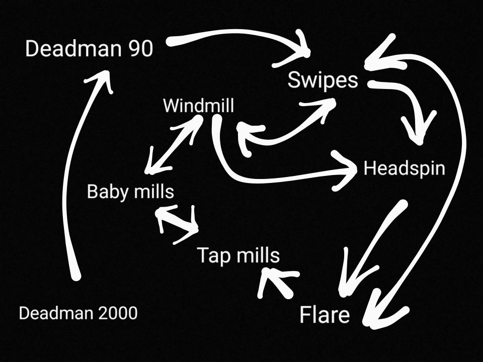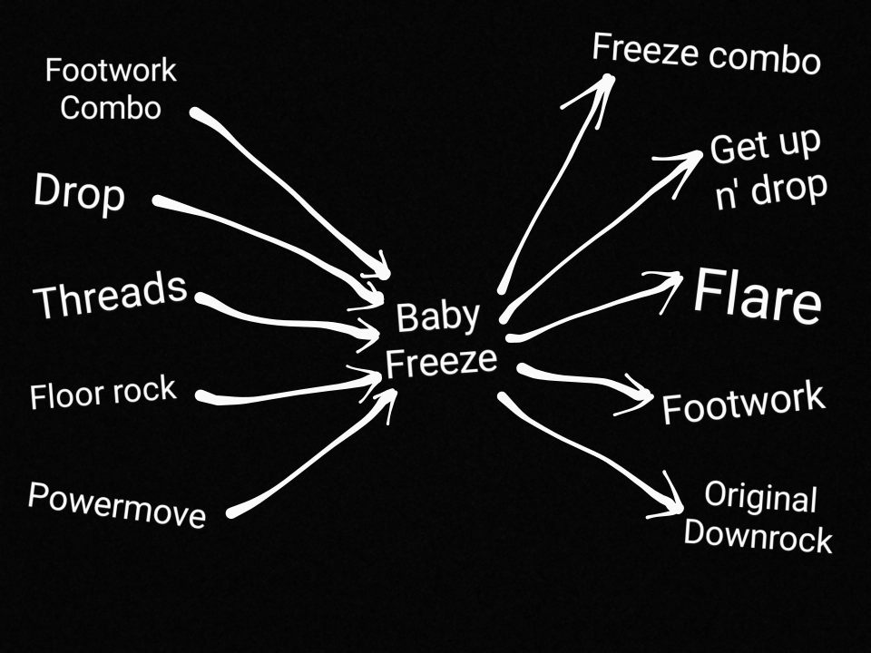 When you practice and freestyle, discover your movement by trying to go into the same move many different ways. How many ways can you go into a simple freeze? How many ways can you get out of that freeze? ANY move can go into ANY move. Bboy Abstrak said: "Go into a move, then try to escape it".