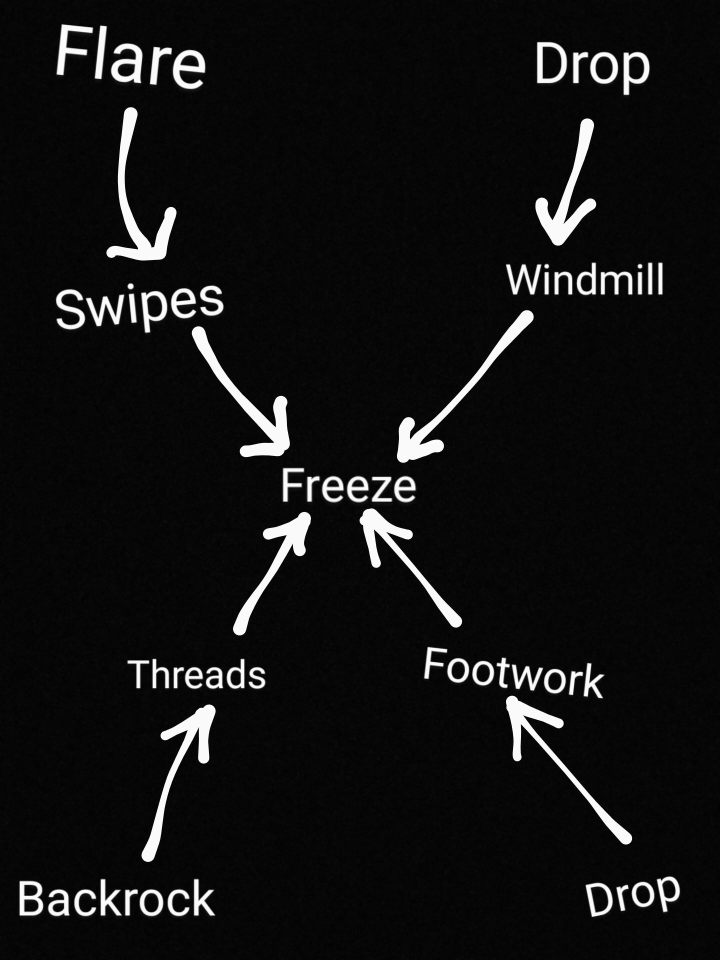 Every element is crucial to the complete dance: FREEZES are important because it is the picture of bboy form; but so are DROPS, DOWNROCK and POWERMOVES. Work to connect every element / movement to another for full expression.