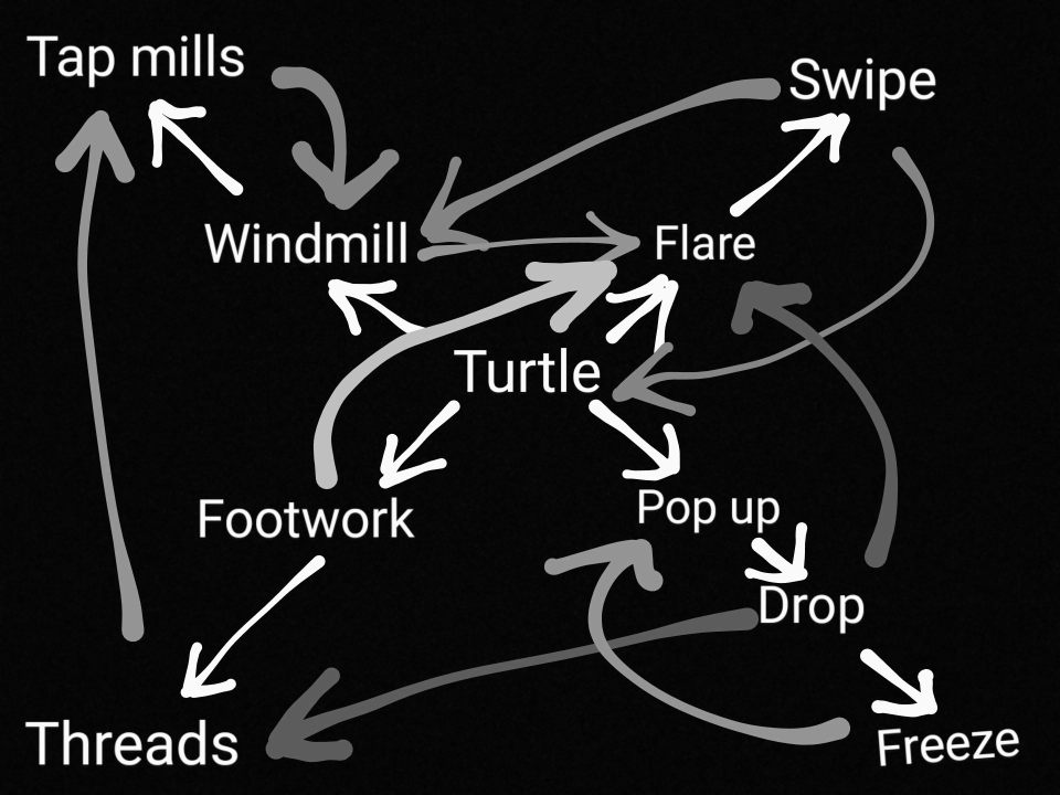 For training, I categorised 5 types of movements, but the boundaries are not absolute. Find out what works for you. Each element has some items, and Conditioning these will make you a stronger dancer: