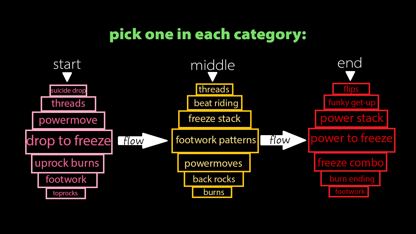 Breaking is a freestyle dance, which means it's just getting down and doing it. While it has a lot of freedom, it has a structure, too. A breaking 'set' or a 'round' can be compared to a spoken statement, but done in movement. It has a beginning, middle, and end. Dance is a Language. It has emphasis and inflection. Typically it starts with TOPROCK, then a DROP to the floor, some mix of DOWNROCK and/or POWERMOVES and ends with FREEZE, but it doesn't have to be in that order, or contain every single element.